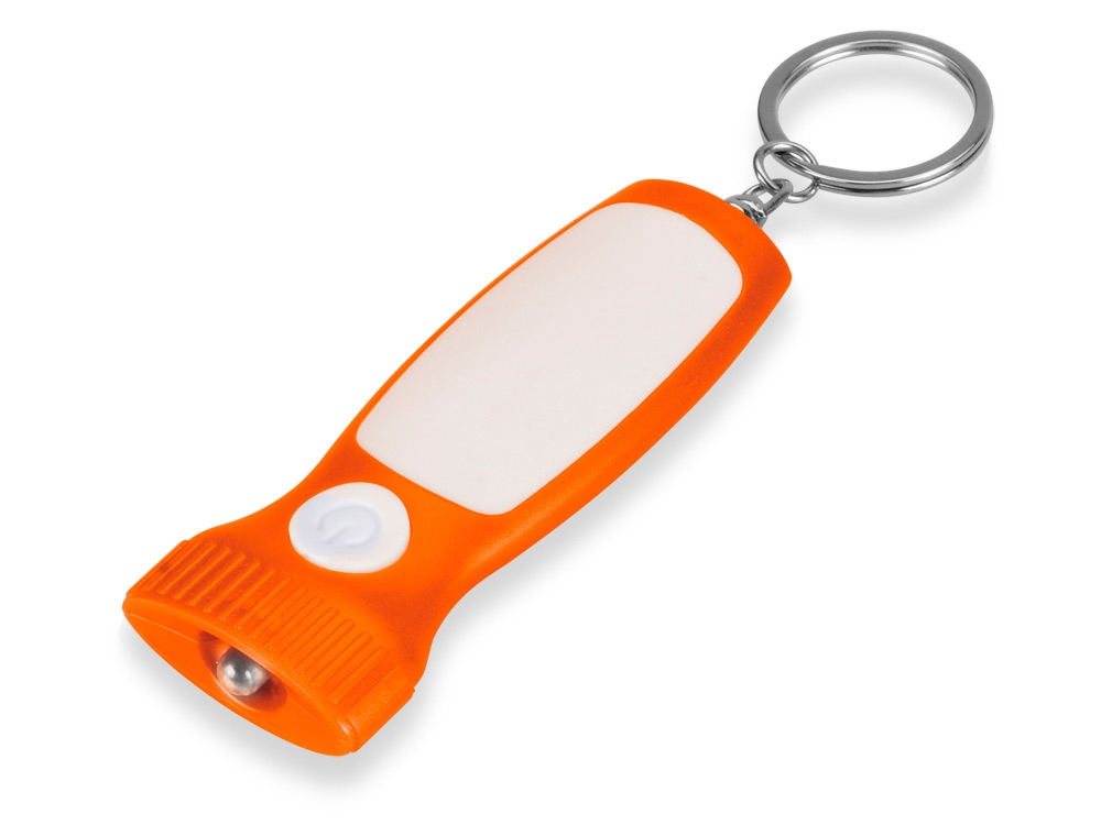 Яркий брелок со встроенным фонариком. Плоская форма и большая ручка с белой вставкой делает брелок удобным для нанесения логотипа.