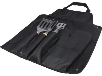 Набор для барбекю из 5 предметов: лопатка (36,5 x 7 см), вилка (36,5 x 2 см), щипцы (36,5 x 5 см), перчатка (25 x 16 см) и фартук с сумкой (42 x 60 см). Ручки сделаны из бамбука, который добывается и производится в соответствии со стандартами устойчивого развития.