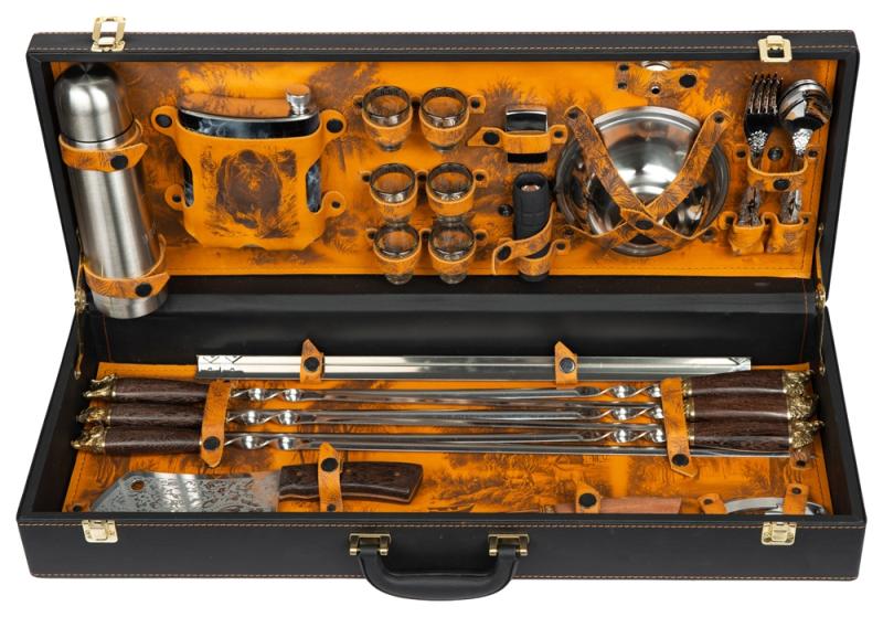 стопки- прозрачный/золотистый, шампура- серебристый/коричневый, дипломат- темно-коричневый