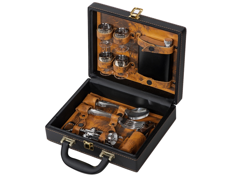 стопки- прозрачный/золотистый, шампура- серебристый/коричневый, дипломат- темно-коричневый