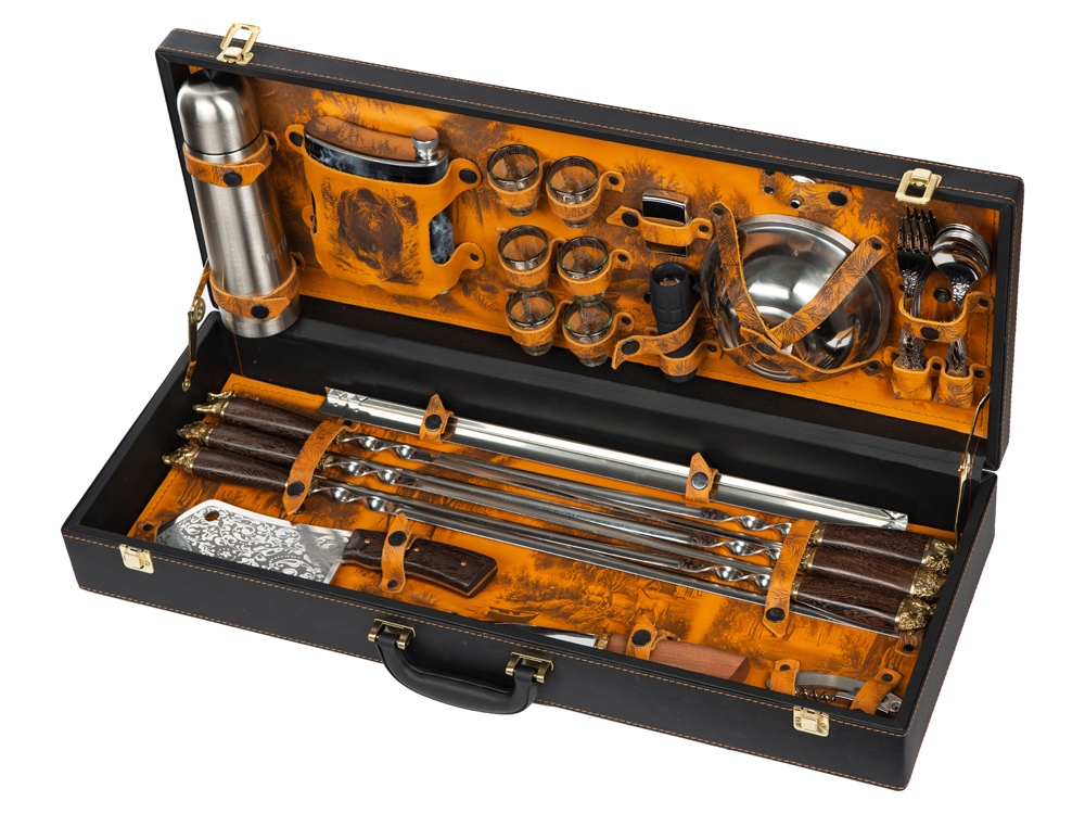 стопки- прозрачный/золотистый, шампура- серебристый/коричневый, дипломат- темно-коричневый
