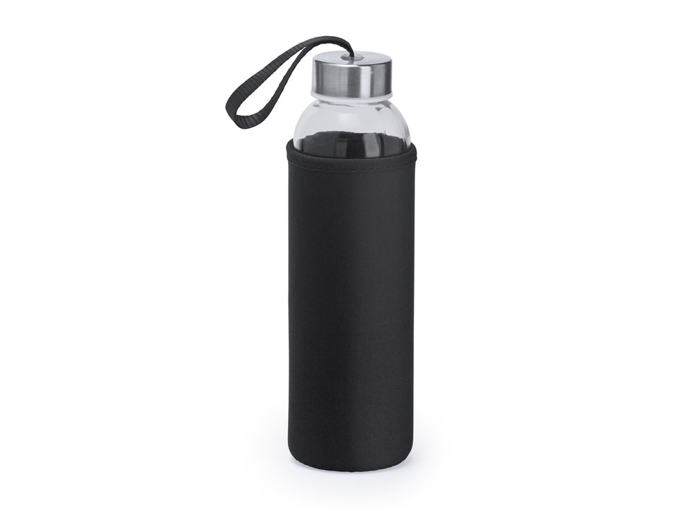 Стеклянная бутылка емкостью 500 мл, чехол из неопрена в сочетании с цветным ремешком для переноски.