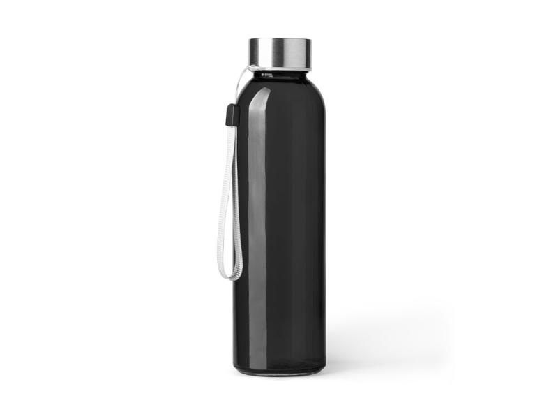 Стеклянная бутылка емкостью 500 мл. Большое разнообразие цветов, с завинчивающейся крышкой из нержавеющей стали и удобной для транспортировки благодаря ремешку серого цвета.