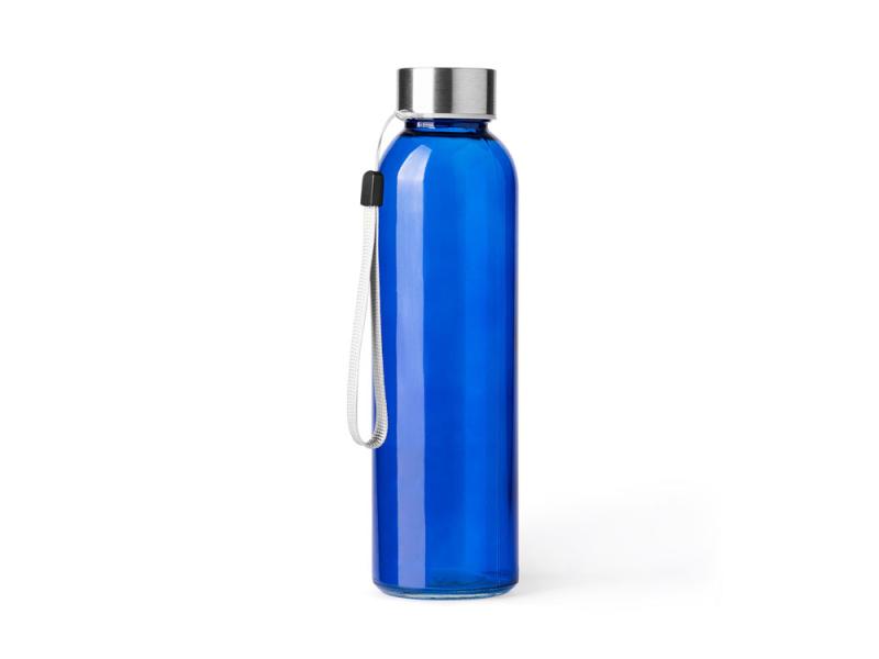 Стеклянная бутылка емкостью 500 мл. Большое разнообразие цветов, с завинчивающейся крышкой из нержавеющей стали и удобной для транспортировки благодаря ремешку серого цвета.