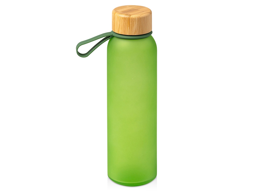 Полупрозрачная бутылка из переработанного стекла. Бамбуковая крышка с держателем. Объём: 500 мл. Поставляется в индивидуальной коробке.