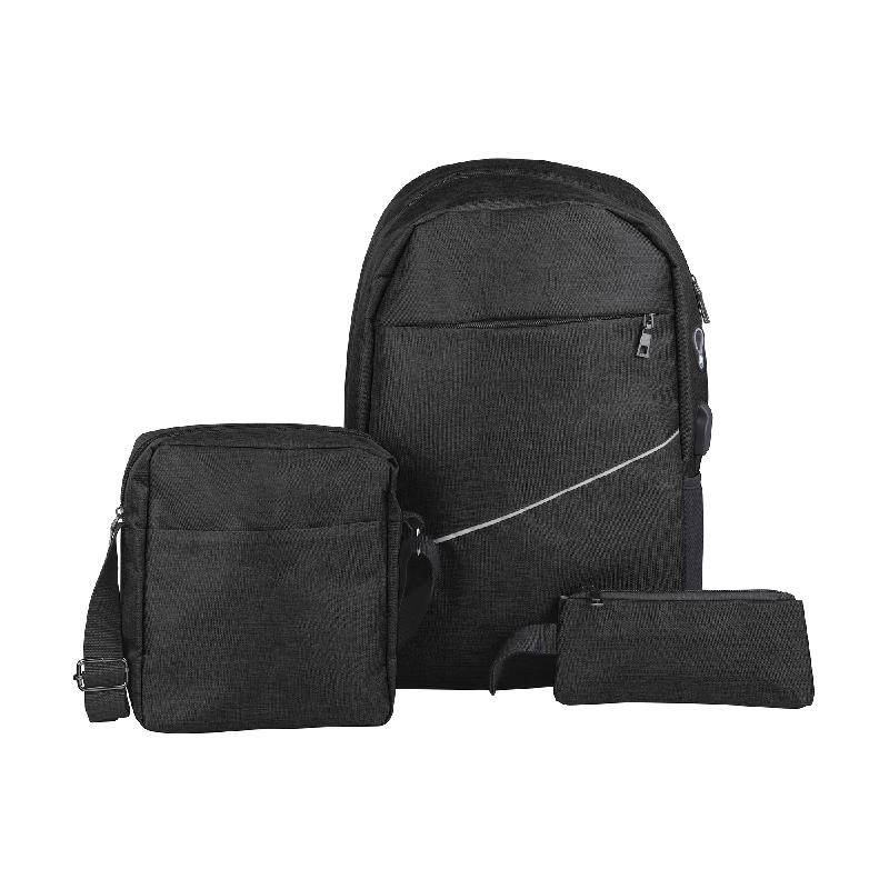 В набор входит: - рюкзак 29 х 40 х 14 см - сумка 21,5 х 23 х 7 см - несессер 20,5 х 9 х 1 см.