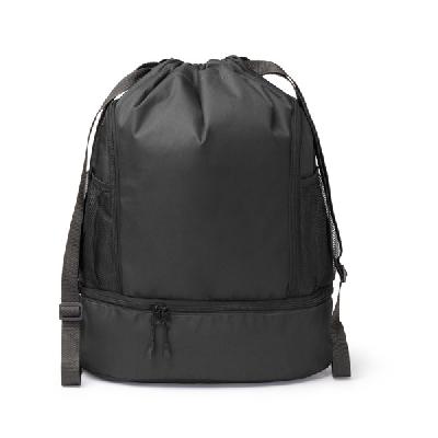 Рюкзак на кулиске регулируемый из полиэстера 600D. Два больших боковых кармана на молнии и два других сетчатых кармана, специально предназначенных для переноски бутылок. В нижней части имеется дополнительное отделение с двойной застежкой-молнией, предназначенное для обуви, одежды или других предметов.