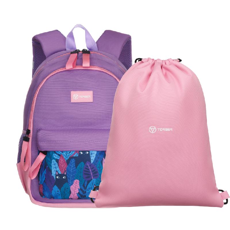 Рюкзак TORBER CLASS X Mini, сиреневый/розовый с орнаментом "Кошки и листья" полиэстер 900D, 35,5 x 25 x 12 см + Мешок для обуви в подарок!