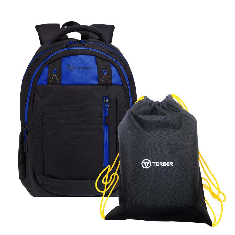 Рюкзак TORBER CLASS X, черный с синей вставкой, 45 x 32 x 16 см + Мешок для сменной обуви в подарок!