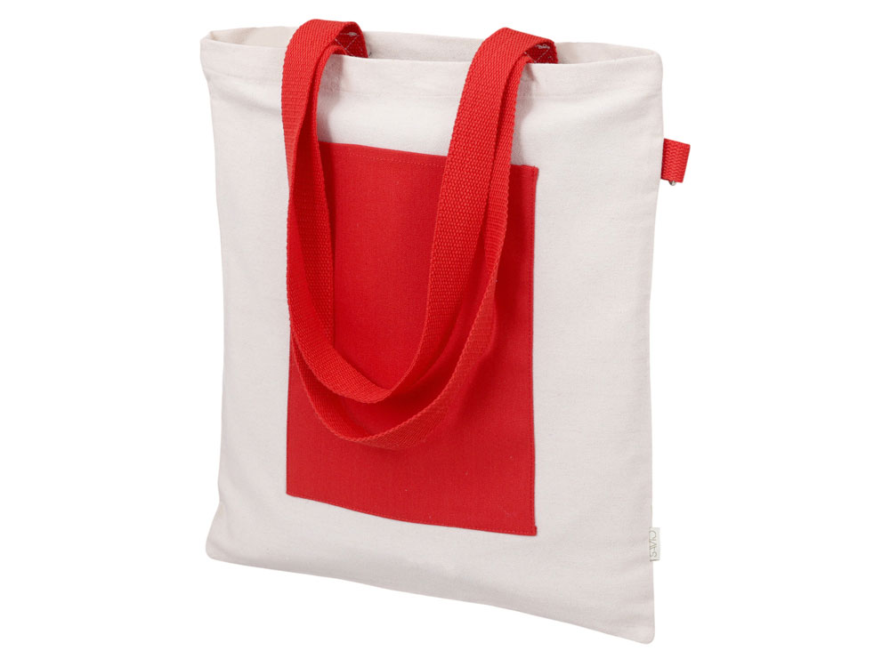 Сумка-шоппер из полностью переработанных материалов с большим контрастным карманом спереди станет стильным аксессуаром для любого случай, как поход в магазин, поездка на пикник или в путешествие. Сбоку предусмотрено д-кольцо для крепления ремувок с вашим логотипом, выполненное из переработанного металла.