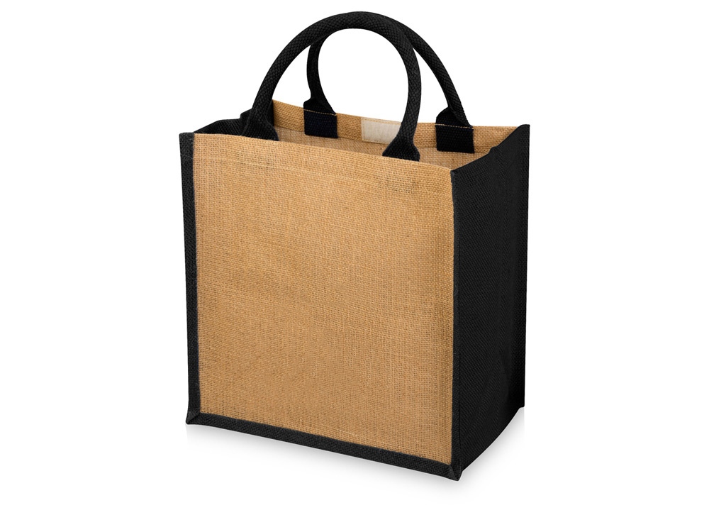 Джутовая подарочная сумка Chennai. Джутовая сумка с ламинированным открытым основным отделением и вставкой. Хлопковые ручки высотой 11,5 см. Джут.