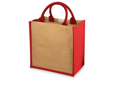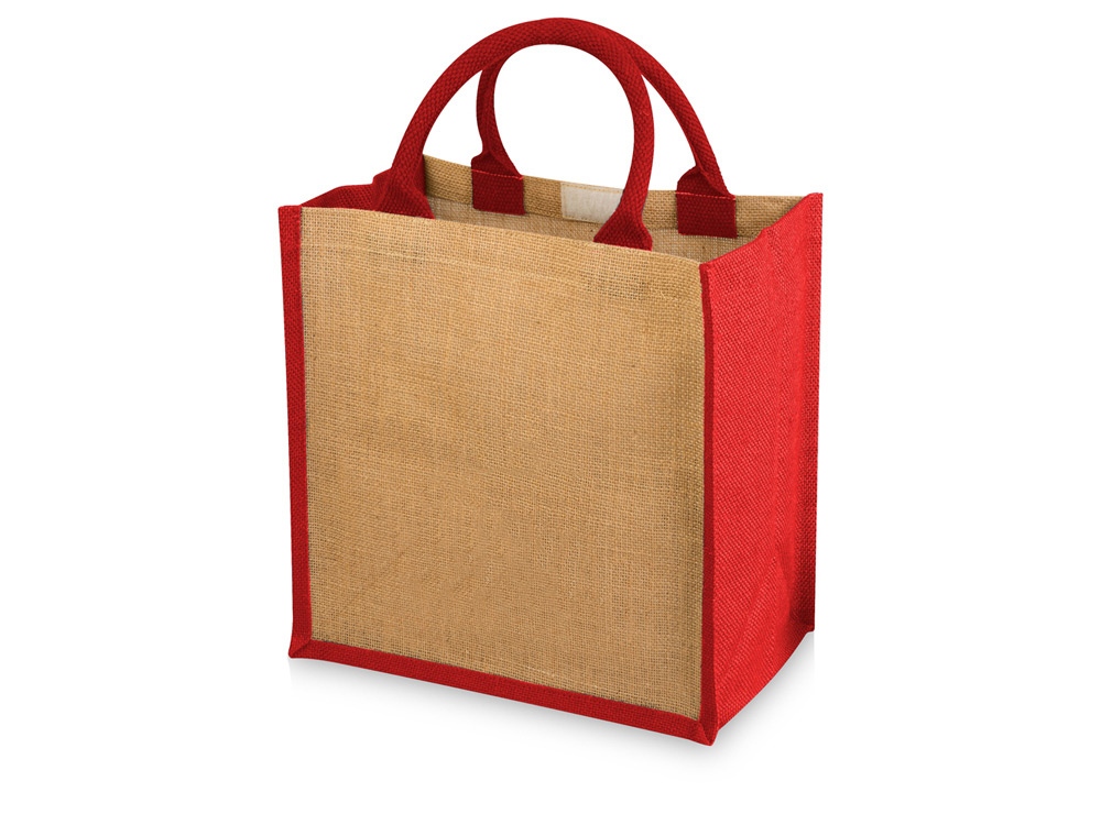 Джутовая подарочная сумка Chennai. Джутовая сумка с ламинированным открытым основным отделением и вставкой. Хлопковые ручки высотой 11,5 см. Джут.