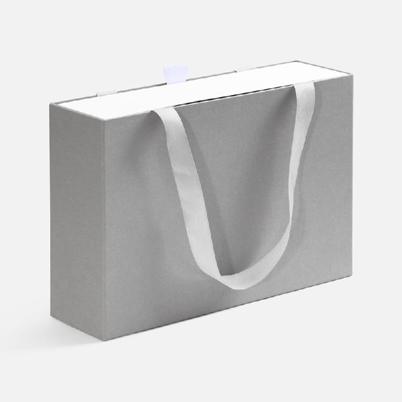 Внешний короб каширован дизайнерской бумаги и оснащен прочными ручками из репсовой ленты. Внутренний короб отделан белой бумагой, ламинированной матовой пленкой.
