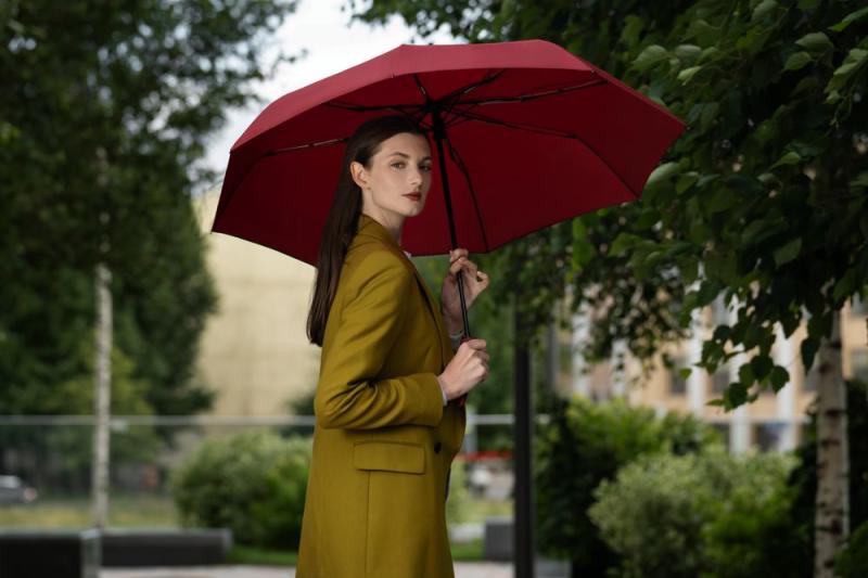 Элегантное решение классического зонта — с надежной ребристой ручкой и насыщенными оттенками купола.