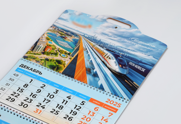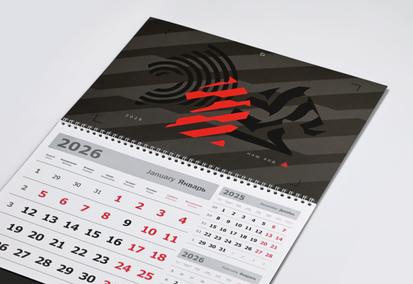 Миди №1 часто выбирают для разработки полностью индивидуального дизайна: при желании мы печатаем индивидуальный календарный блок – сетку месяцев в фирменном оформлении, чтобы календарь выглядел уникально. Дизайн постера сверху также полностью под заказчика – сюда можно добавить фотографию офиса, продукции или тематическое изображение.