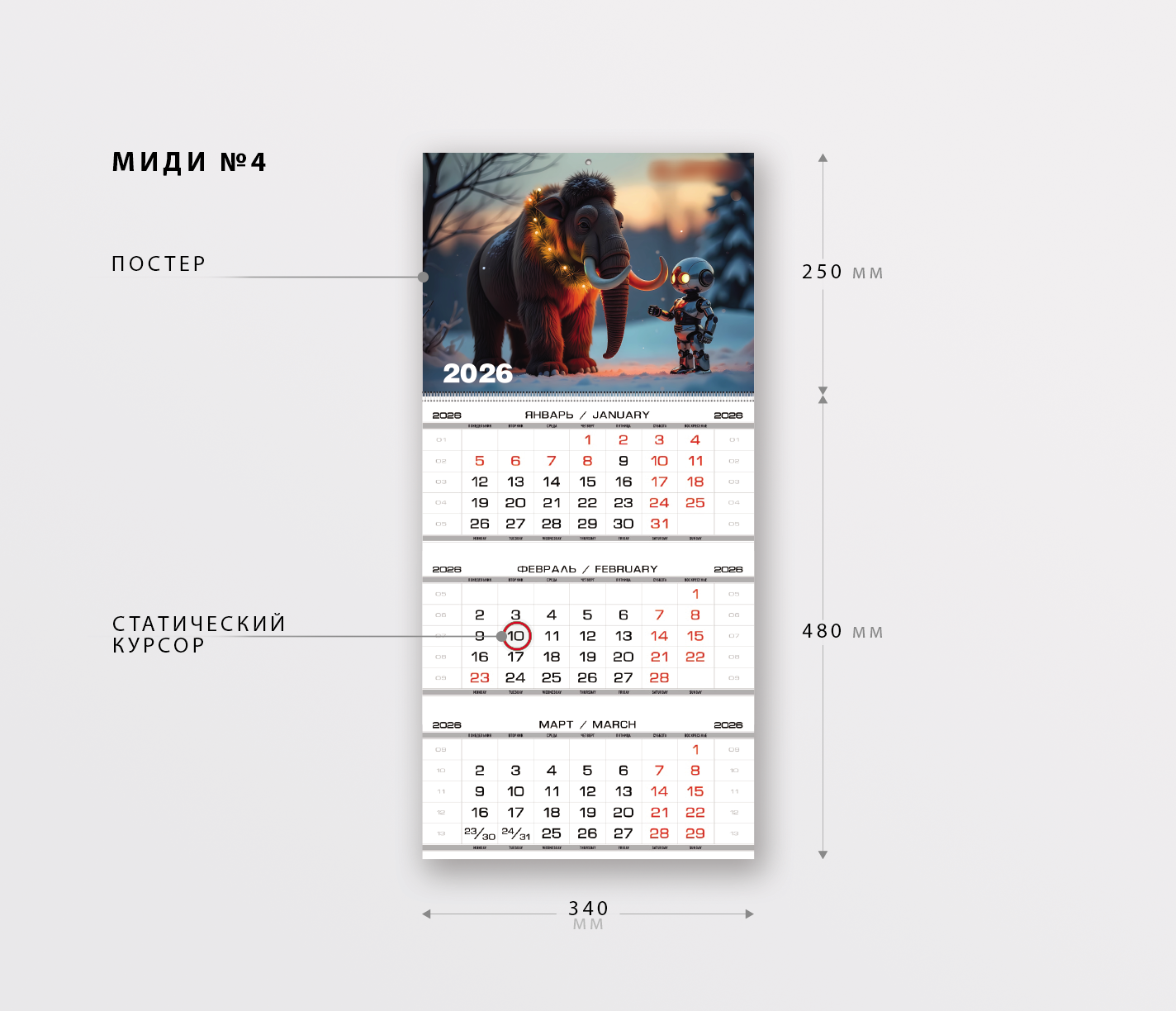МИДИ №4 – упрощенная модель квартального календаря формата миди. Она имеет один рекламный блок (нижний) и один верхний постер без смены по сезонам. Такое решение выбирают, когда требуется лаконичный корпоративный календарь с минималистичным дизайном.