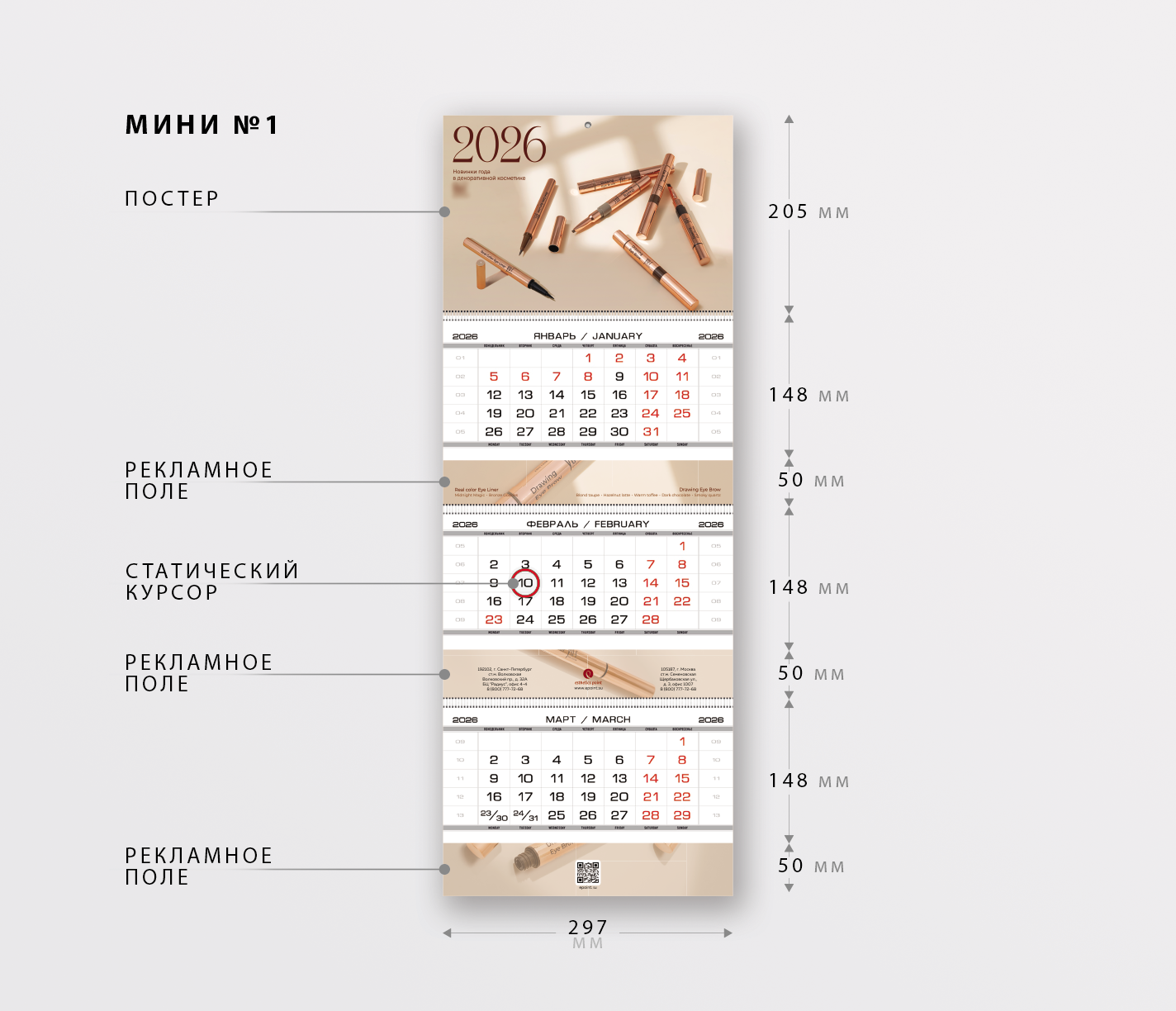 Мини №1 идеально подходит компаниям, которым нужно максимум пространства для информации на компактном носителе: три рекламных поля позволят разместить слоган, адреса, акции или разные сообщения для каждого квартала года.