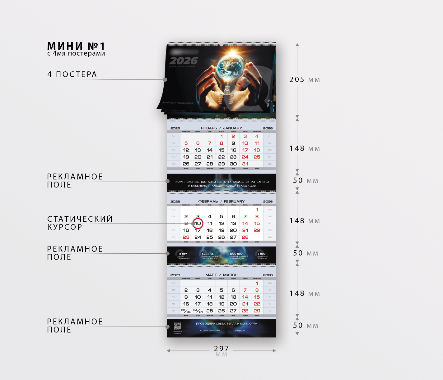 Мини №1 4 постера – выбор для тех, кто хочет буквально всё и сразу от компактного календаря: максимум брендинга плюс динамичный дизайн, который не надоедает аудитории в течение года.