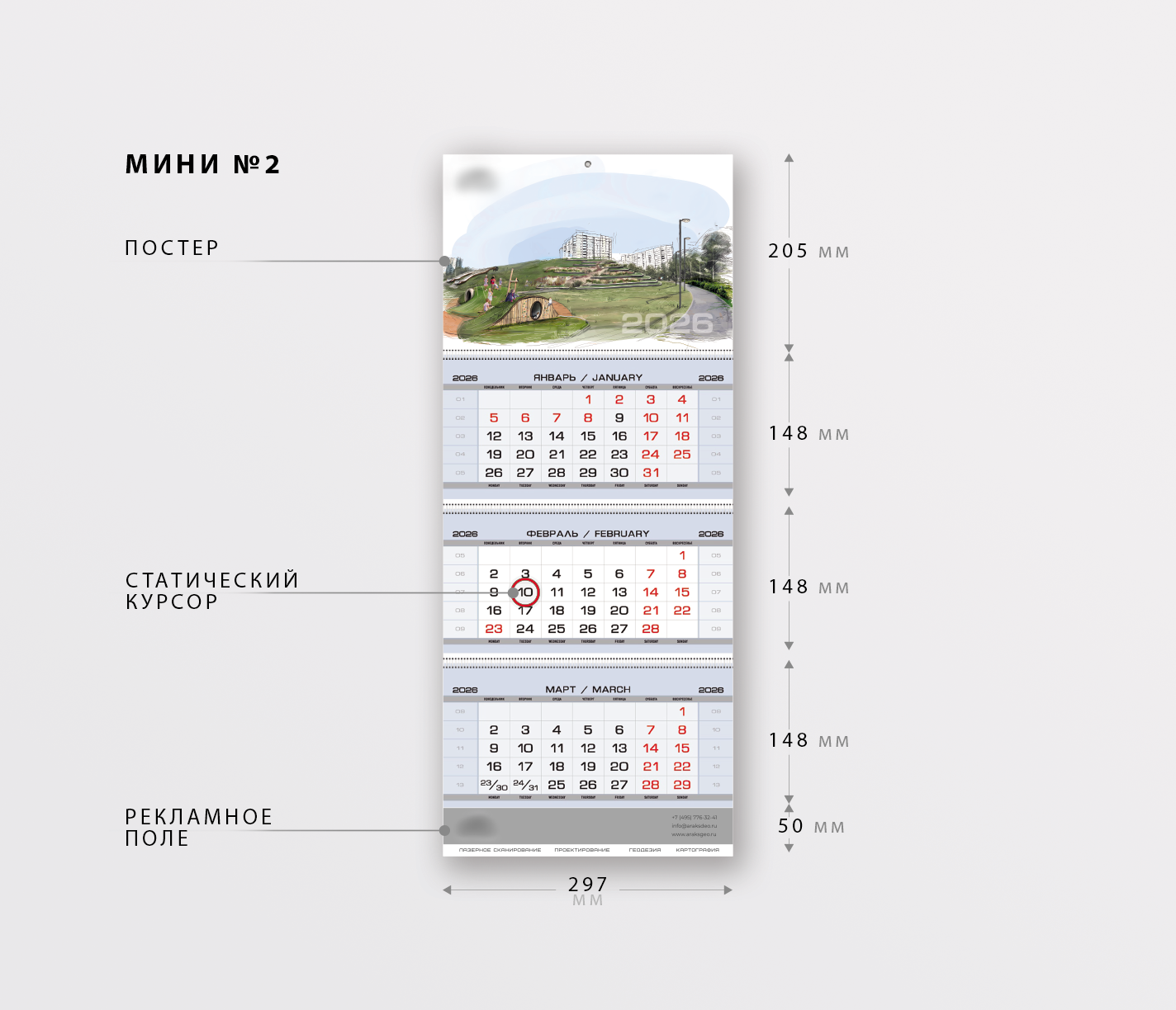 МИНИ №2 – оригинальный мини-календарь с акцентом на визуальную составляющую. Его ключевая особенность – четыре постера: в верхней части каждый квартал года может оформляться отдельным изображением. Это значит, что дизайн шапки меняется 4 раза в год, поддерживая интерес и отражая сезонные темы или разные продукты компании.